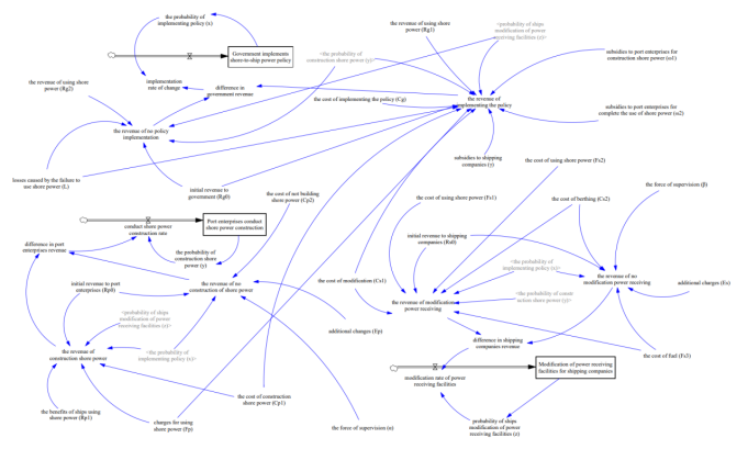 论文作者盛进路教授介绍,他和他的团队成员运用演化博弈模型和系统动力学方法,剖析了多方主体参与下的政策发展趋势,探究船舶岸电推广政策的有效性和可行性,并从三方演化博弈的角度拓展了岸电在推广博弈过程中寻求动态均衡的新视角。通过构建政府、港口企业和航运公司三方参与的演化博弈模型,动态分析了船舶岸电系统中各利益相关主体决策行为造成的影响,进而得到多元主体参与的船舶岸电推进演化机制,为岸电推进应采取的政策措施提供科学依据。