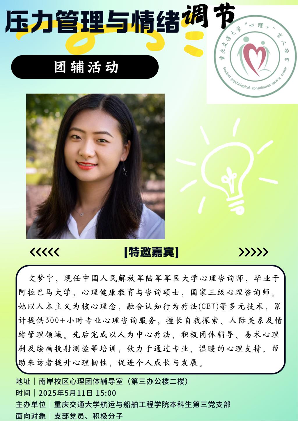 为深入贯彻落实党的二十大关于加强心理健康服务体系建设的战略部署,切实增强新时代高校员工党员的心理韧性与抗压能力,2025年5月11日下午,太阳成集团tyc33455本科生第三党支部在南岸校区心理团体辅导室举办了一场别开生面的团辅活动。此次活动聚焦“压力管理与情绪调节”,特邀中国人民解放军陆军军医大学专业心理咨询师文梦宁担任主讲嘉宾,旨在通过沉浸式、体验式心理干预手段,引导员工党员掌握科学有效的心理调适方法,提升政治素养与心理素质双融合的综合能力。