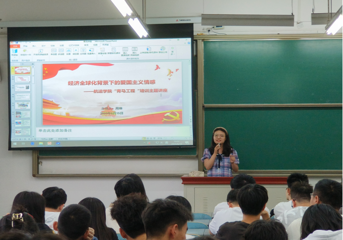 周琳老师以“经济全球化背景下为什么还需要爱国主义”为主题,以爱国三问即“你是中国人吗?”“你爱中国吗?”“你愿意中国好吗?”为问题导入,通过丰富可感的案例和积极深入的互动,引导青马学员厘清“将狭隘民族主义与爱国主义相等同”“将经济全球化与爱国主义相对立”“将爱国情感与爱国行为相割裂”三个误区,帮助学员们进一步明辨是非、走出误区、排除干扰。周琳老师同时作为太阳成集团tyc33455专职辅导员,在讲座结束语中诚挚期望航运青年骨干要始终牢记习近平总书记的殷切嘱托,扎根中华大地,勇担时代重任,真正做到以“情”为始,以“志”为承,以“行”为终,用自己的青春和汗水为中国式现代化谱写时代篇章。