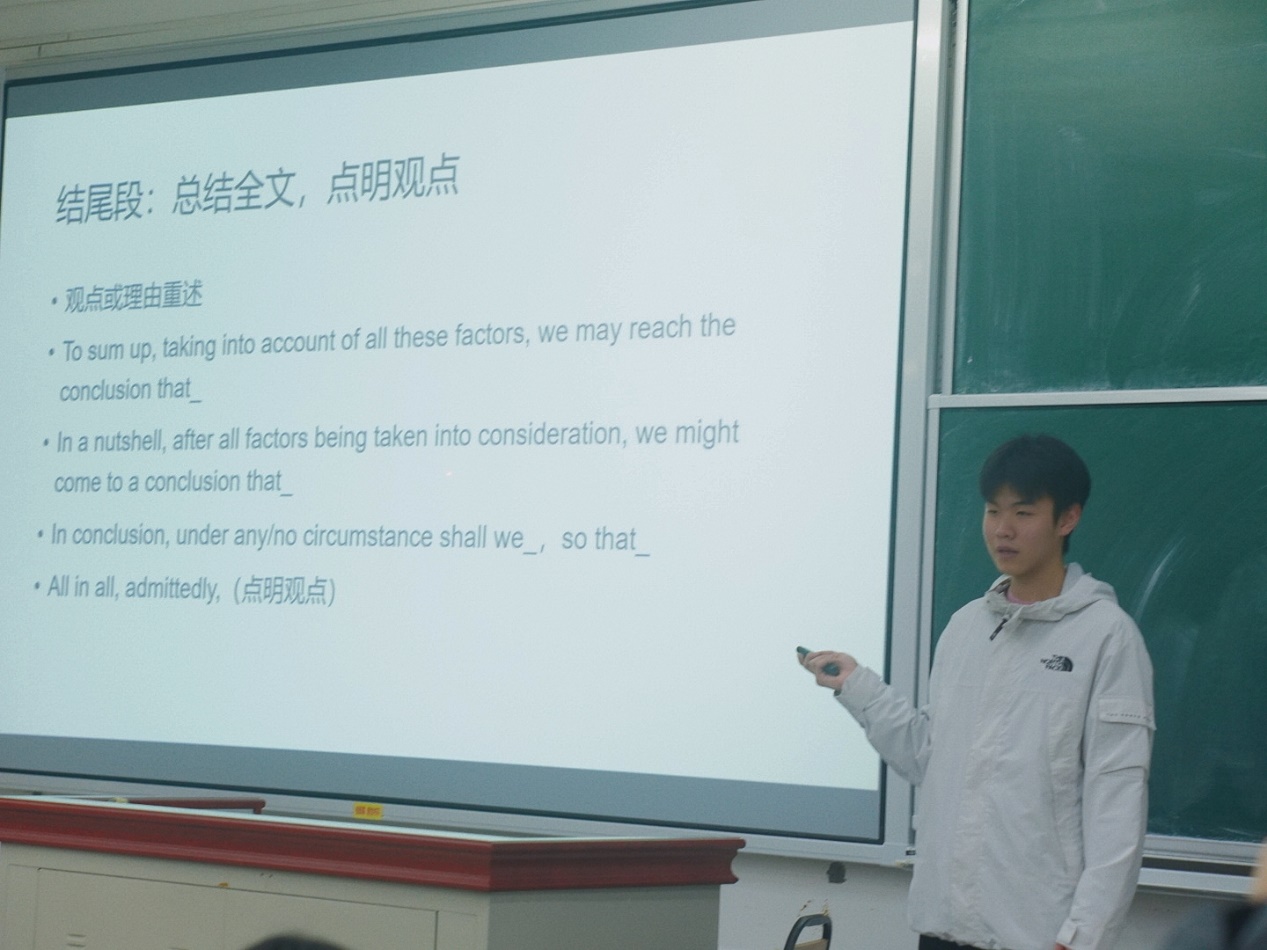 本次四六级交流会共分为三个环节:主题演讲、互动交流和答疑解惑。在主题演讲环节,来自22级船舶与海洋工程专业的王泽昊同学,六级考试成绩557分,为在场的学子们详细解读了四六级考试的题型、难度、评分标准等方面的知识,帮助同学们更加清晰地了解四六级考试的要求。此外,王泽昊还从词汇、语法、阅读、写作等方面为同学们提供了实用的备考技巧,让同学们受益匪浅。