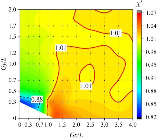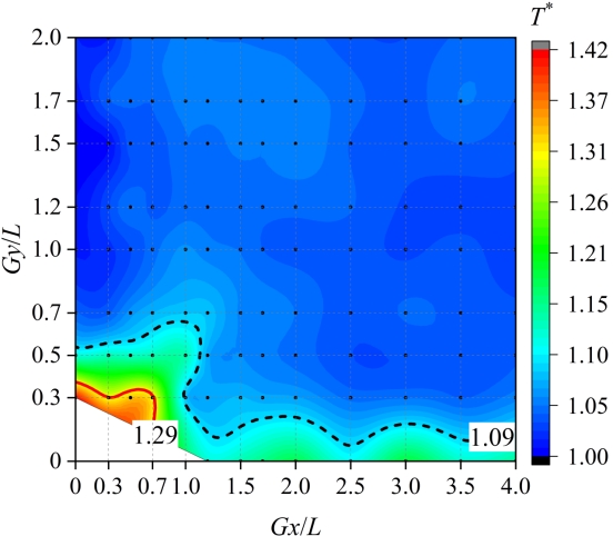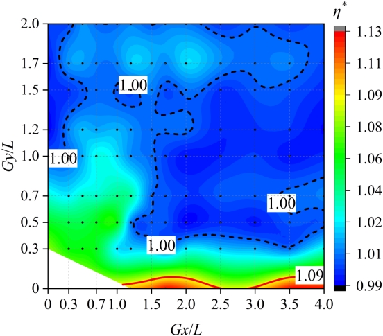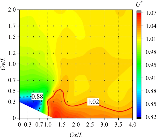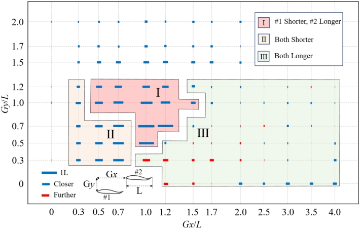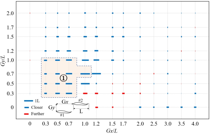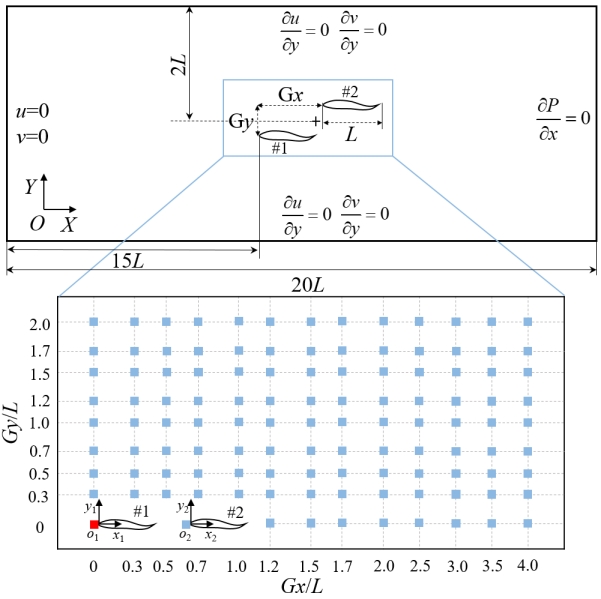 数值研究结果表明,当两条鱼以紧凑队形游动时,水动力干扰显著增强,最大推力提升可达42%,效率提升达13%。但当间距过小时,反而会因压力干扰导致游动速度与位移下降。最优性能出现在纵向间距比Gx/L= 1.0、横向间距比Gy/L= 0.5的条件下,此时两条鱼的速度与位移均提升约7%。