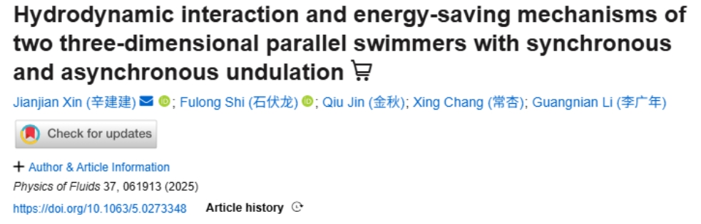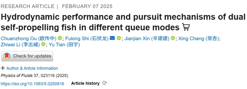 近日,​太阳成集团tyc33455石伏龙博士科研团队受AIP出版社(AIPP学术微信公众号)邀请,精选其研究成果“Hydrodynamic performance and pursuit mechanisms of dual self-propelling fish in different queue modes”,并在微信公众号上进行了发布。该团队的多篇相关研究成果已刊登于国际流体力学卓越期刊《Physics of Fluids》。