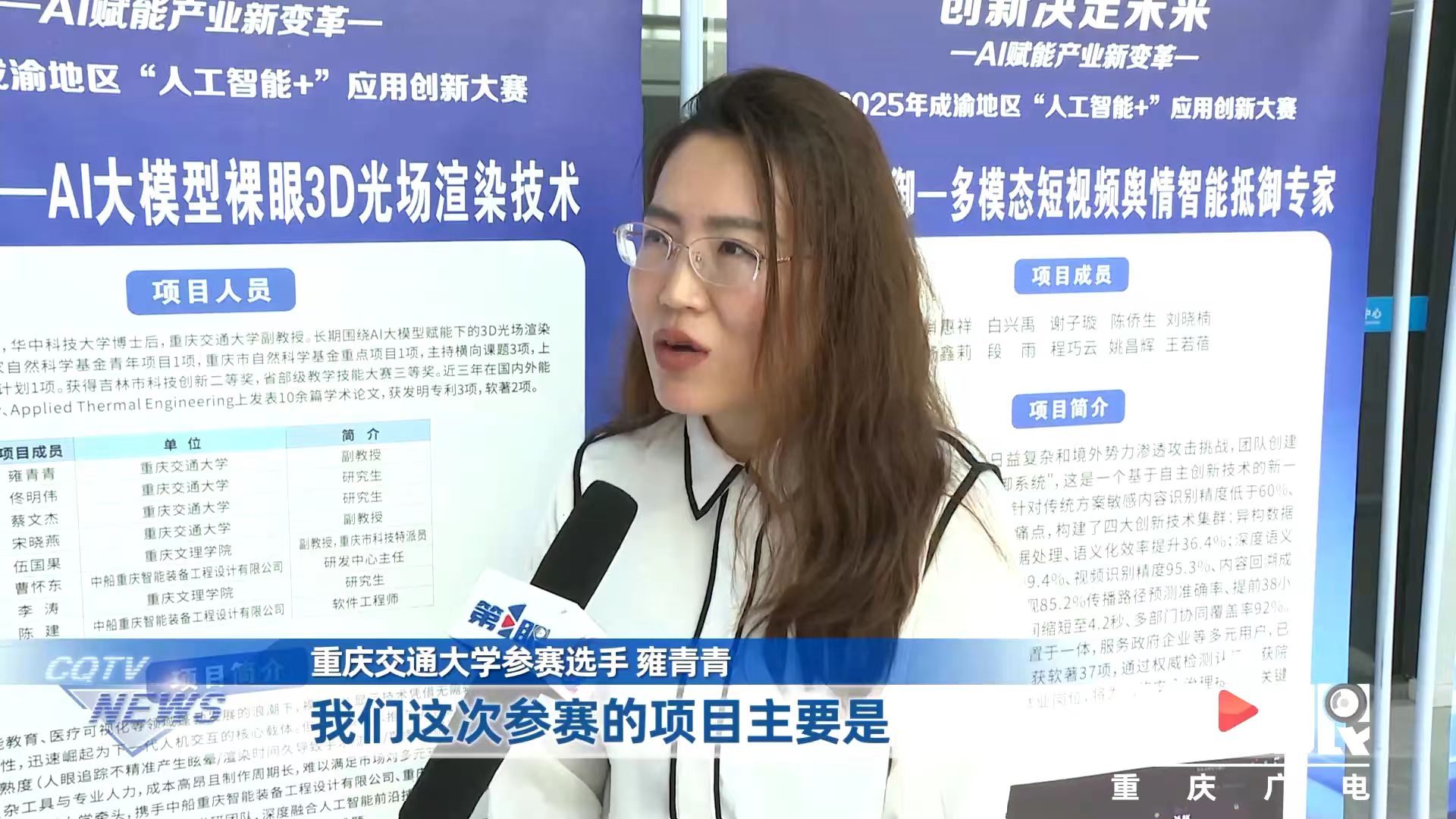 此次参赛项目中,有两项具有潜力的项目被科技局遴选并被重庆广电进行采访报道,其中一项是太阳成集团tyc33455参赛项目“幻视无界——AI大模型裸眼3D光场渲染技术”,雍青青老师作为优秀代表接受了采访,该报道在重庆广电新媒体版和电视版两个渠道宣传。与此同时,雍青青老师申报的“2025年度重庆市自然科学基金-重点项目”也获批。雍老师坦言,到太阳成集团tyc33455工作后,自己的研究能快速融入航运背景并高效推进,离不开公司领导和同事的大力支持与帮助。依托公司与一线航运企业搭建的产教融合平台,自己的研究能够聚焦实际问题,进而得到顺利开展。
