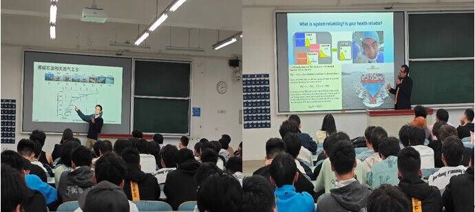 活动伊始,盛进路经理介绍了公司的发展历史和团队建设情况,随后陪同各位专家在科学城校区分别开展了精彩的学术讲座,给师生们带来了船舶与海洋工程领域最新的研究成果,并结合实例详细阐述了相关理论的应用和前景。活动现场气氛热烈,座无虚席。生动形象的讲授之余,专家们还和现场的同学们积极互动,耐心解答同学们的诸多问题,并与同学们分享了其研学经历,鼓励同学们挑战自我、持之以恒、拓宽视野、打开思路,稳固专业基础,未来成为一名优秀的工程师,共绘中国海洋强国蓝图。